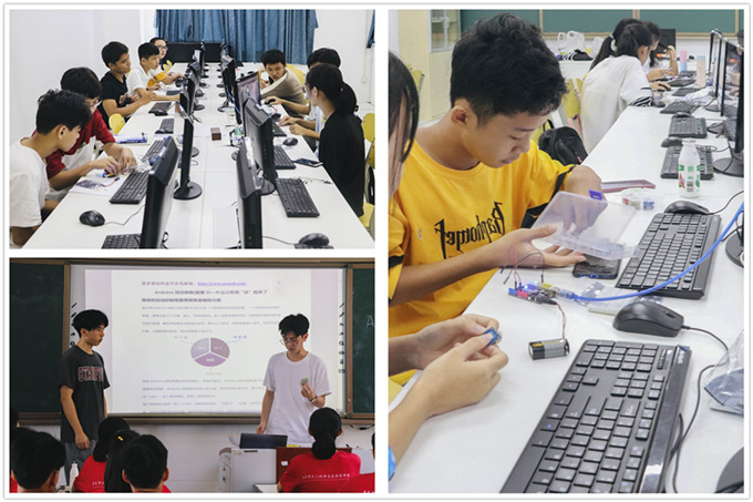 在“Arduino单片机入门教程”课程中,实践团队采取授课教师与学生共同动手完成的教学形式,制作声控灯、温度报警器、脉搏测量器等简单有趣的小装置,让同学们了解了编程相关知识与基于单片机的软硬件协同实例,激发了同学们的兴趣与求知欲。