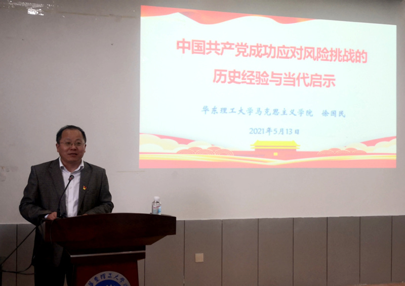 为深入学习贯彻习近平总书记在党史学习教育动员大会上的重要讲话精神,高质量开展党史学习教育,5月13日下午,上海市委宣讲团党史宣讲团专家组成员、我校马克思主义学院副院长徐国民教授受邀作了题为“中国共产党成功应对风险挑战的历史经验与当代启示”专题辅导报告,机动学院全体教职工参加。报告会由机动学院党委书记杨强主持。