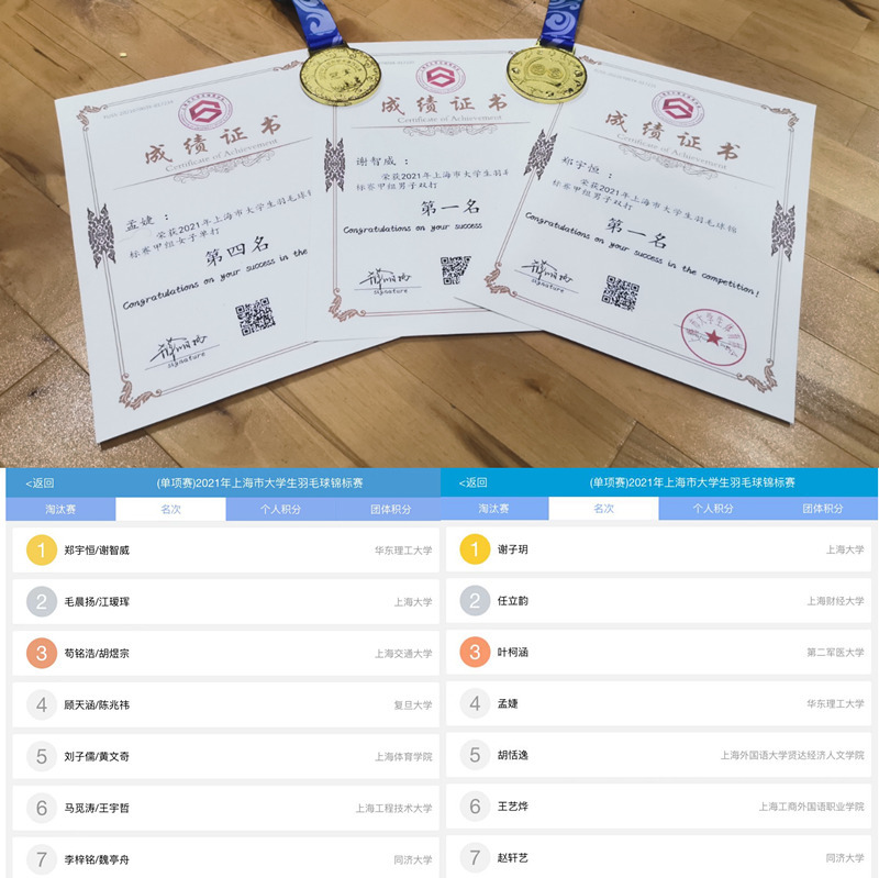2021年上海市大学生羽毛球锦标赛由上海市教育委员会主办,上海市大学生体育协会、同济大学承办,上海市大学生体育协会羽毛球分会协办。在来自复旦、交大、华理等上海市39所高校的参赛代表队伍中,我校羽毛球队一路过关斩将,突出重围,以良好的心理素质、稳定的发挥和高超的球技获得甲组男子双打第一名(郑宇恒/谢智威)、女子单打第四名(孟婕)的好成绩。
