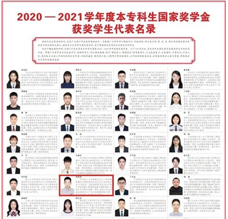5月4日,《人民日报》刊登《2020-2021学年度本专科生国家奖学金获奖学生代表名录》,我校beat365官方网站机械设计制造及其自动化专业2018级本科生张钰炯从6万名本专科国家奖学金获奖学生中脱颖而出,作为全国100名优秀学生代表荣登该名录。