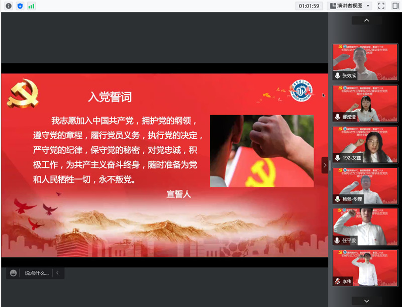 最后,全体毕业生党员在杨强的带领下,面对屏幕上鲜红的党旗,庄严地举起右手,握紧拳头,共同重温入党誓词。坚定有力的誓言,使每一位毕业生党员又一次接受了深刻的党性教育。