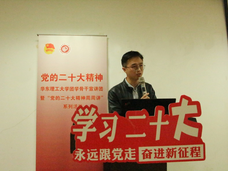 11月22日下午,由校团委主办,机动学院团委承办的党的二十大团学骨干宣讲团“党的二十大精神周周讲”系列首场宣讲活动在奉贤校区大活215举行。2019年度“中国大学生自强之星”、2020上海大学生年度人物获得者、beat365官方网站博士后刘懿谦做了主题为“服务海洋强国战略 把论文写在蓝色国土上”的宣讲。