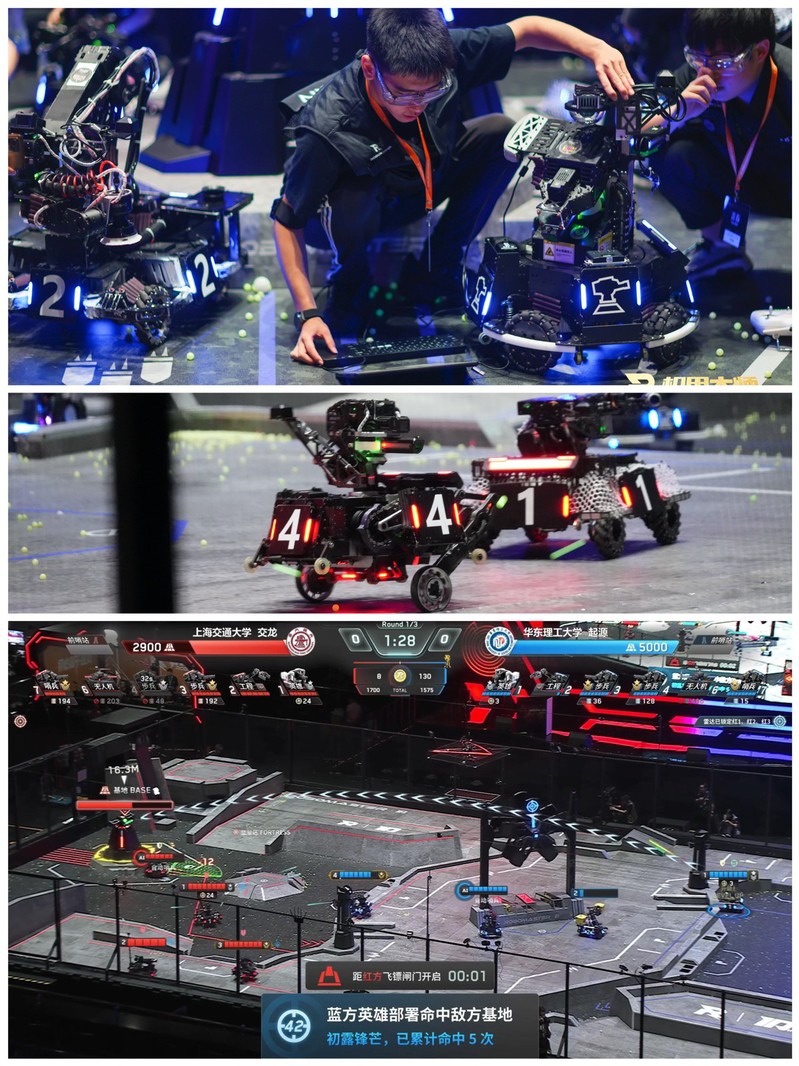 起源战队由beat365官方网站牵头,依托机械实验教学中心组建,虽仅有两年建队历史,但在大赛中凭借串联构型轮腿机器人的卓越地形跨越能力、哨兵机器人优秀的全向感知和自主导航以及英雄机器人和飞镖系统的超远程精准击打等表现,成功小组出线并取得晋级资格。赛中,起源战队与老牌劲旅“三冠王”上海交通大学交龙战队的比赛成为本轮赛事的焦点。开场阶段,我方哨兵机器人凭借精准导航和自主识别能力快速前压,步兵机器人和空中机器人协同封锁对方进攻路径,英雄机器人不断完成远距离打击,一度以5000:1700的优势领先,尽管最后时刻惜败于交龙战队,但经此一役,成功打响了“华理制造”的品牌,起源战队也赢得了现场观众与裁判的一致认可。