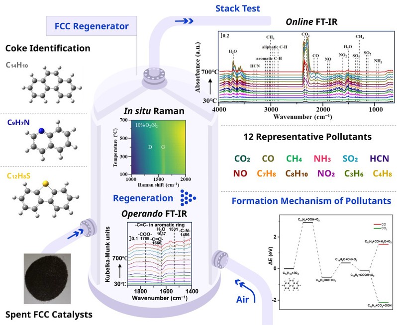 本研究通过对三套工业典型FCC装置外排烟气开展现场监测,系统明确了172种污染物和3种温室气体的排放特征。通过多种表征技术对结焦的工业待生FCC催化剂进行解析,识别了焦炭沉积物的特征物种和分子结构。研究人员建立起适用于催化剂高温再生的原位谱学系统,开展不同氧气气氛下的再生实验,通过原位拉曼(in-situ Raman)和原位红外(operando FT-IR)探究了焦炭物种的演变,同时结合在线红外(online FT-IR)监测气体污染物的生成,揭示了焦炭在再生过程中的分解行为与气体污染物生成之间的内在关联。基于所鉴定的典型焦炭分子和原位实验的过程演变,通过密度泛函理论(DFT)计算,阐明了CO、CO2、SO2、NO、HCN和NH3等主要污染物的形成机理,从分子水平构建了从积碳到烟气污染物的完整转化路径。