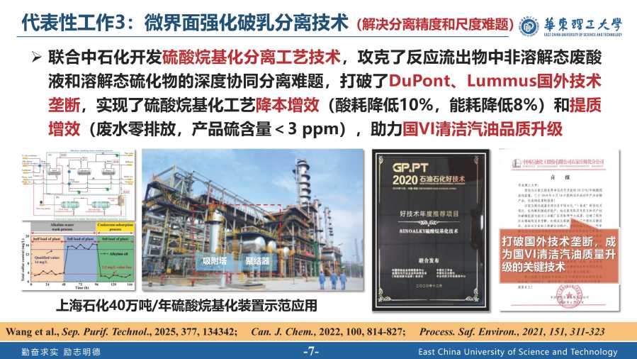 坚持面向科技前沿和国家重大需求,长期致力于非均相体系多维度、跨尺度、多物理场耦合的强化分离理论、技术和装备研发。先后入选上海市“超级博士后”人才激励计划(2019)、上海市青年科技英才扬帆计划(2020)。主持国家自然科学基金面上及青年项目、科技部国家重点研发计划(子课题)、国防科工局基础产品创新科研项目(课题)、中国博士后科学基金特别资助等国家级及省部级项目,以及中石油、中石化等企业委托的技术开发项目。迄今已发表学术论文近50篇,其中SCI收录40余篇,总影响因子300+,他引1000余次,包含Chemical Society Reviews 、Chemical Engineering Journal 、Journal of Hazardous Materials 等化学工程、环境工程、分离工程领域顶级期刊,1篇入选第五届中国科协优秀科技论文(全国共97篇,化学工程学科仅此1篇);申请中国发明专利21件,已授权17件,完成专利转化2件